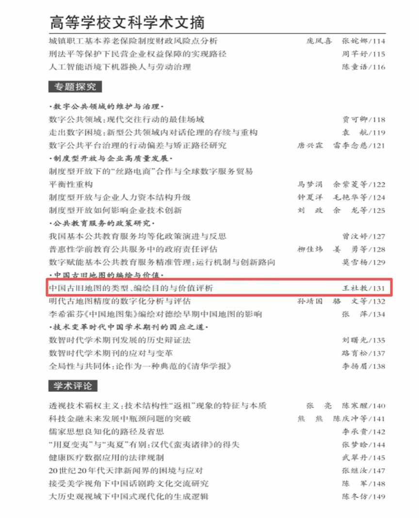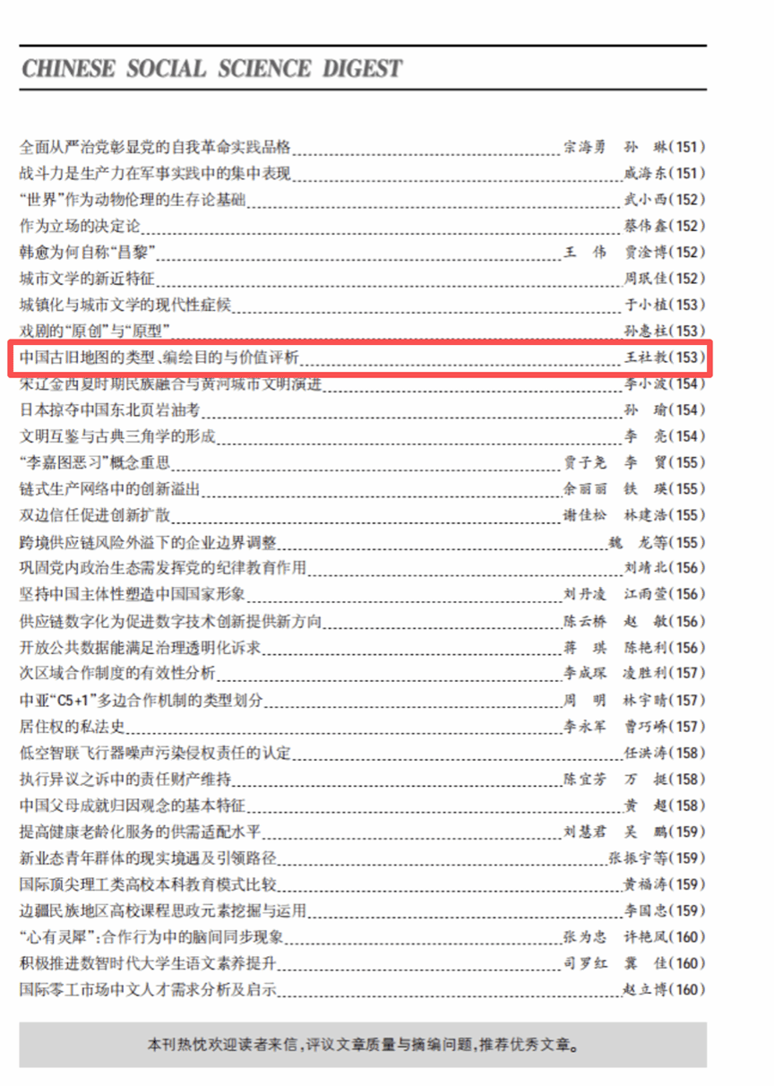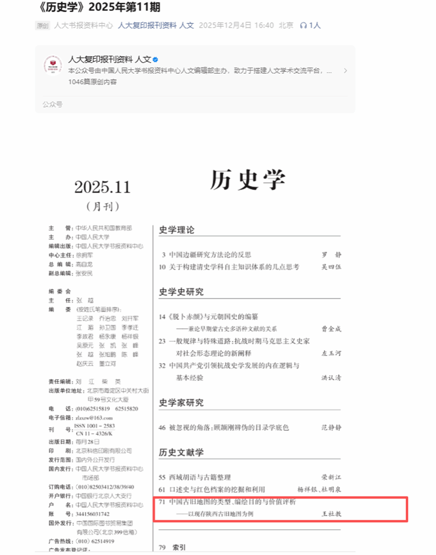 我院研究员、博士生导师王社教论文《中国古旧地图的类型、编绘目的与价值评析——以现存陕西古旧地图为例》刊登于《安徽史学》2025年第5期,该学术成果发表后,在学术界产生了积极反响与良好学术影响。文章先后被《人大报刊复印资料》2025年第11期全文转载,《高等学校文科学术文摘》2025年第12期摘编,《中国社会科学文摘》2025年第12期摘编。
